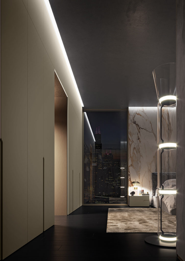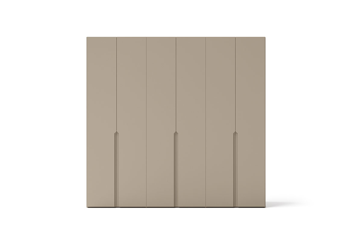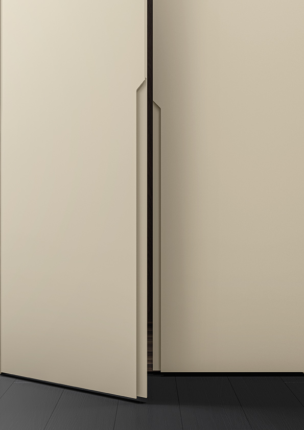 Superfici come seta ed eleganti grafismi. Un taglio a regola d’arte segna i frontali delle ante a battente, caratterizzando il modello. Creare sempre qualcosa di unico.Maniglia a gola sui frontali e fianchi.