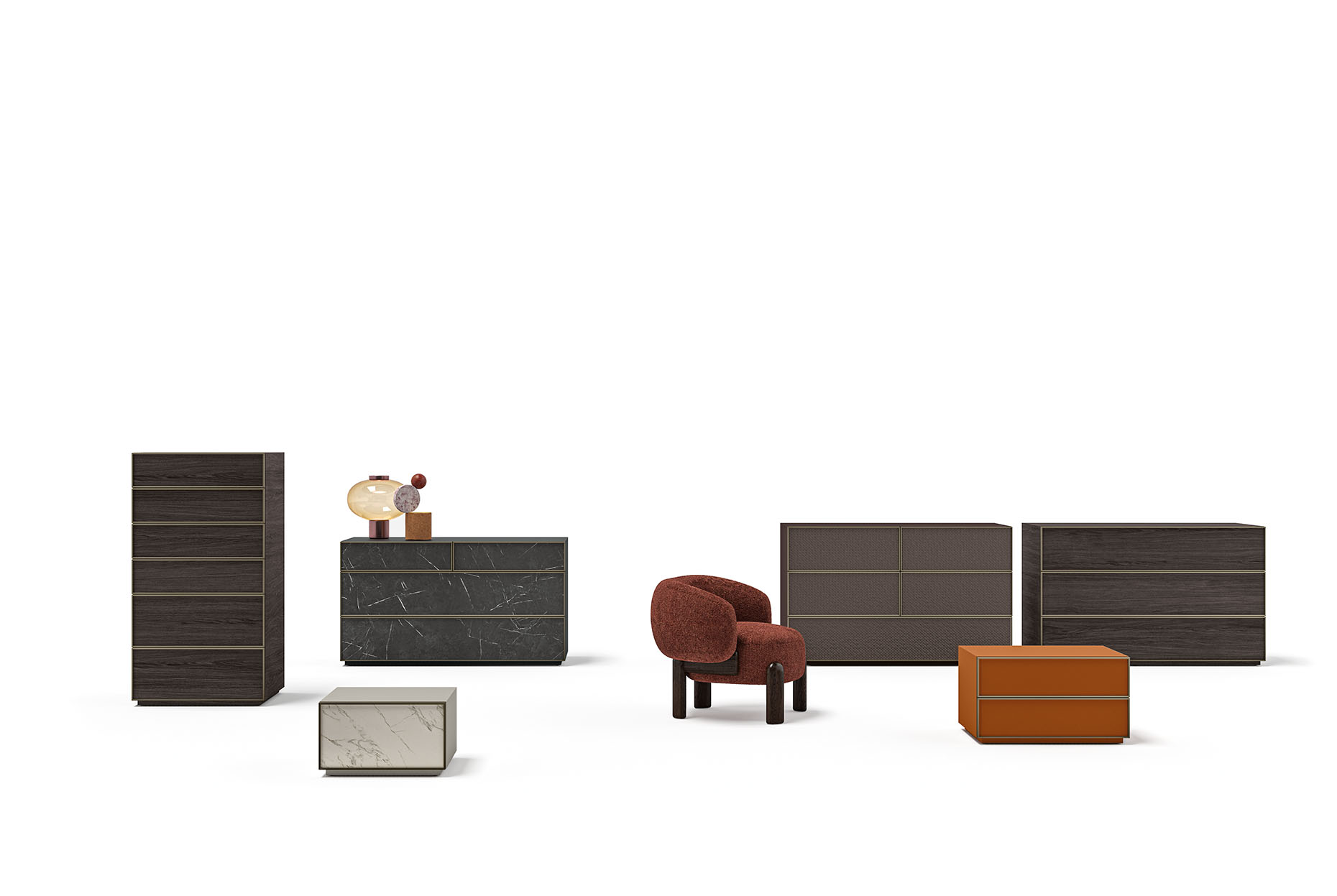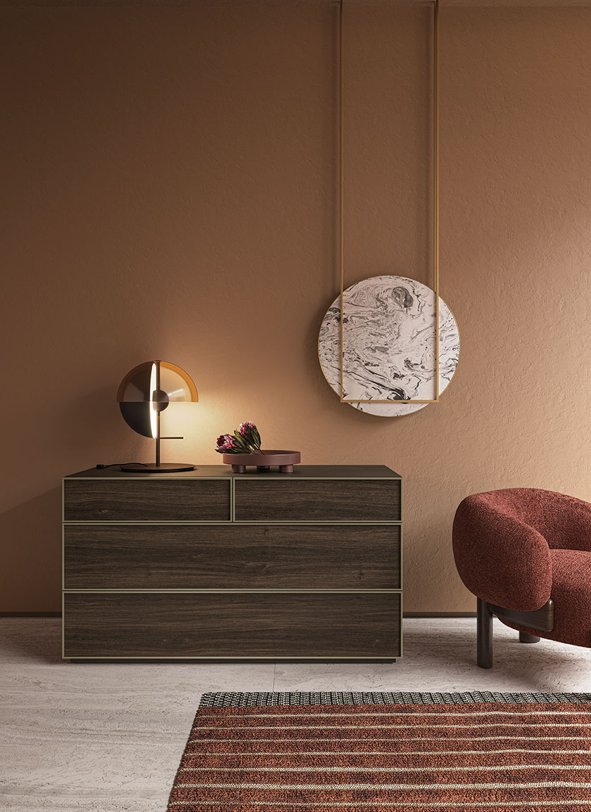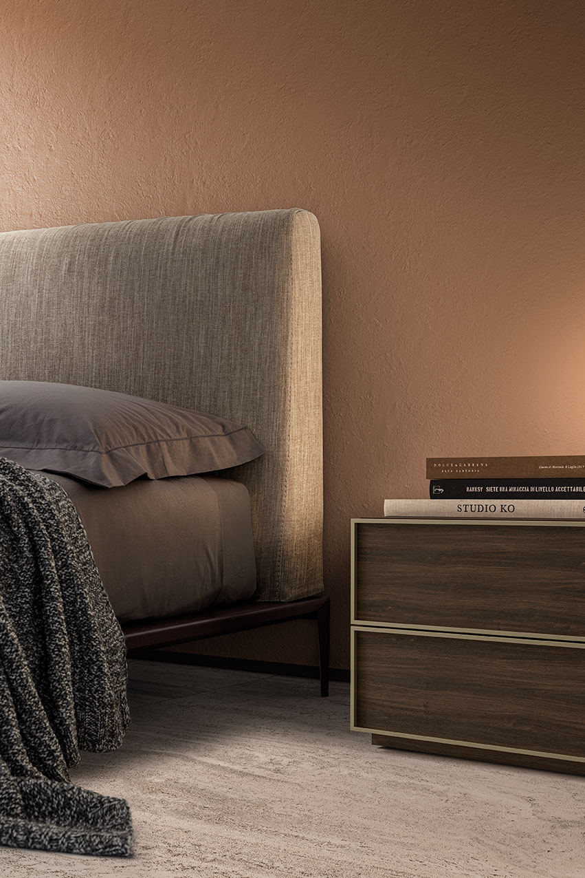 Ogni Gruppo Notte Cornice, dotato di struttura realizzata in pannelli di particelle di legno. Cassetti con profilo alluminio frontale arretrato.