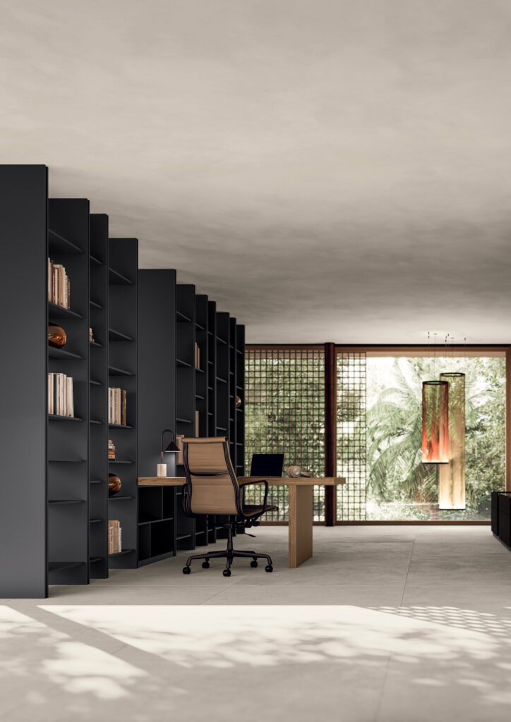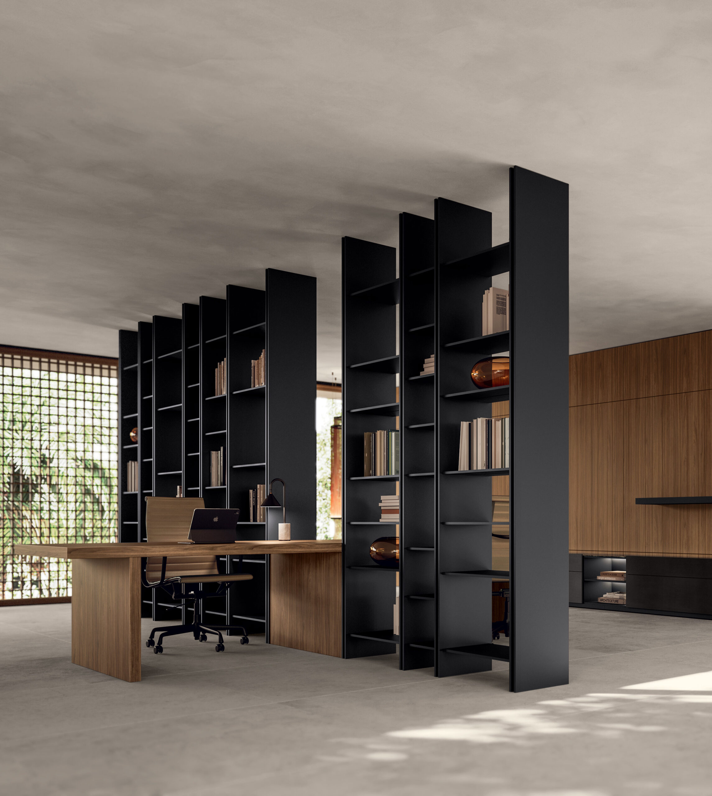 La libreria sottile è caratterizzata da spalle portanti, con struttura a “sandwich”, definite dall’utilizzo di due pannli sp. 14 mm interrotti da elementi distanziali, definiti listelli Anima di sp. 14 mm e larghezza 18mm. Tre altezze, due profondità, e quattro differenti preconifgurazioni, permettono di creare, in larghezza, infinite combinazioni.